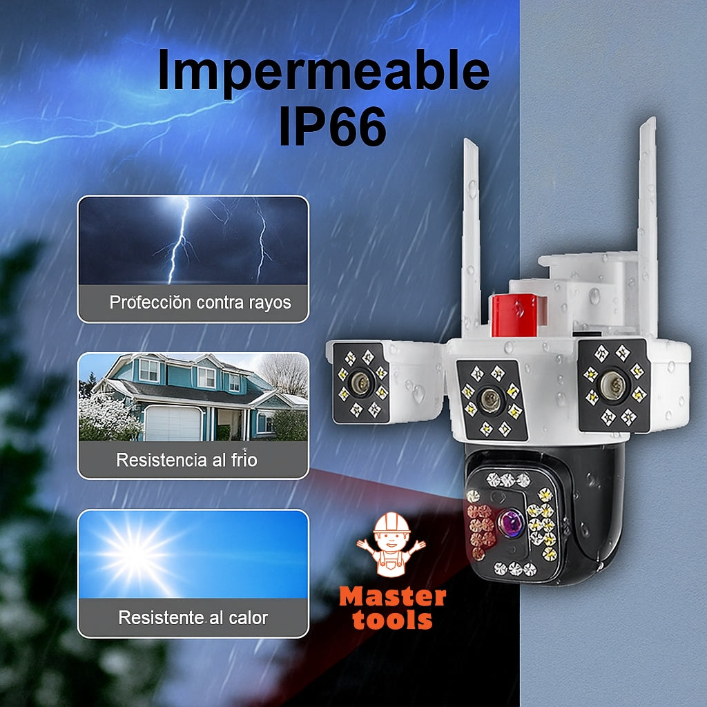 Cámara de Seguridad WiFi 3 en 1 – 3 Lentes 6K | Visión Nocturna + Alarma + Zoom