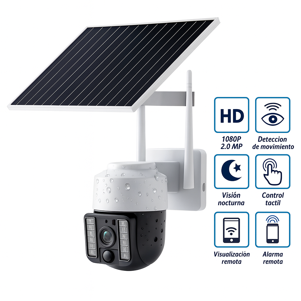 Vigilancia inalámbrica con energía solar + batería recargable, ideal para patios, fachadas, fincas y comercios. Ofrece visión nocturna en color, audio bidireccional y alertas en tiempo real a tu teléfono para una seguridad práctica y eficiente.