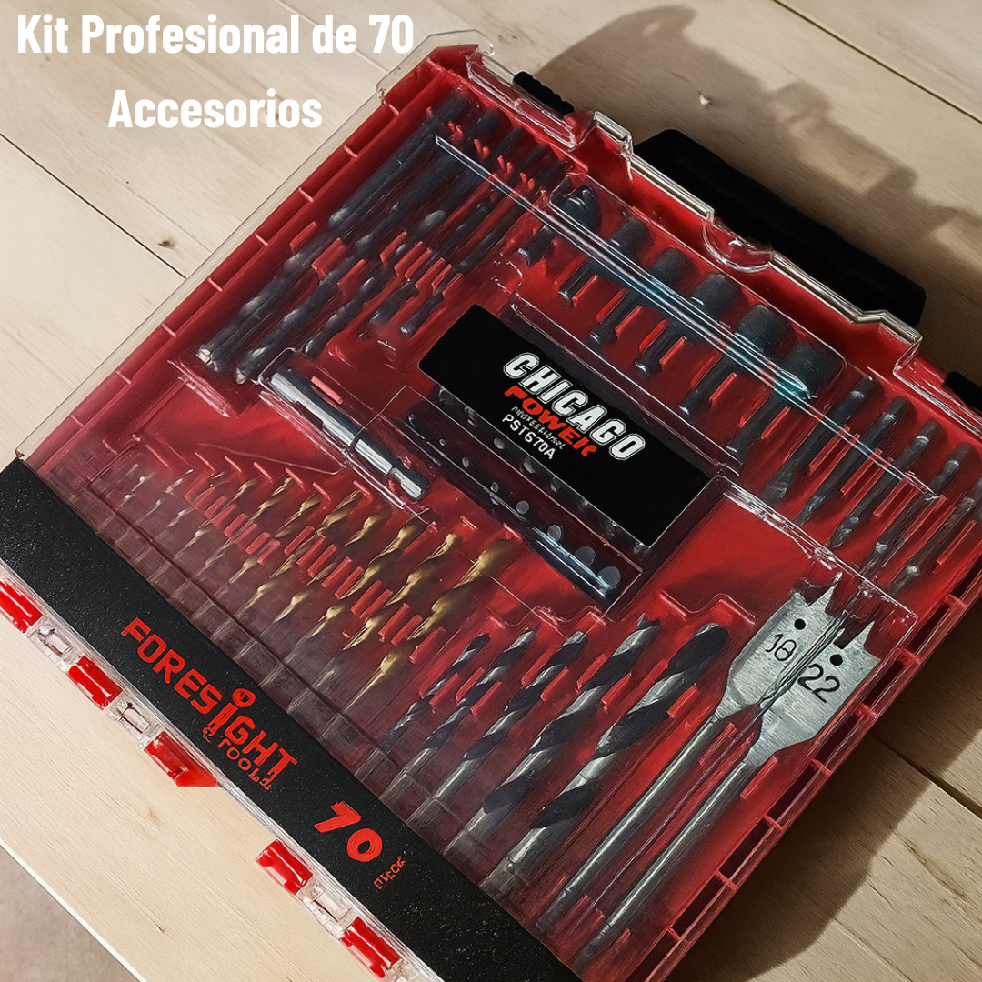 Este juego de 70 piezas es la solución perfecta para trabajos de bricolaje y uso profesional. Está diseñado para perforar paredes, madera y metal, además de atornillar y ajustar diferentes tipos de tornillos y tuercas.