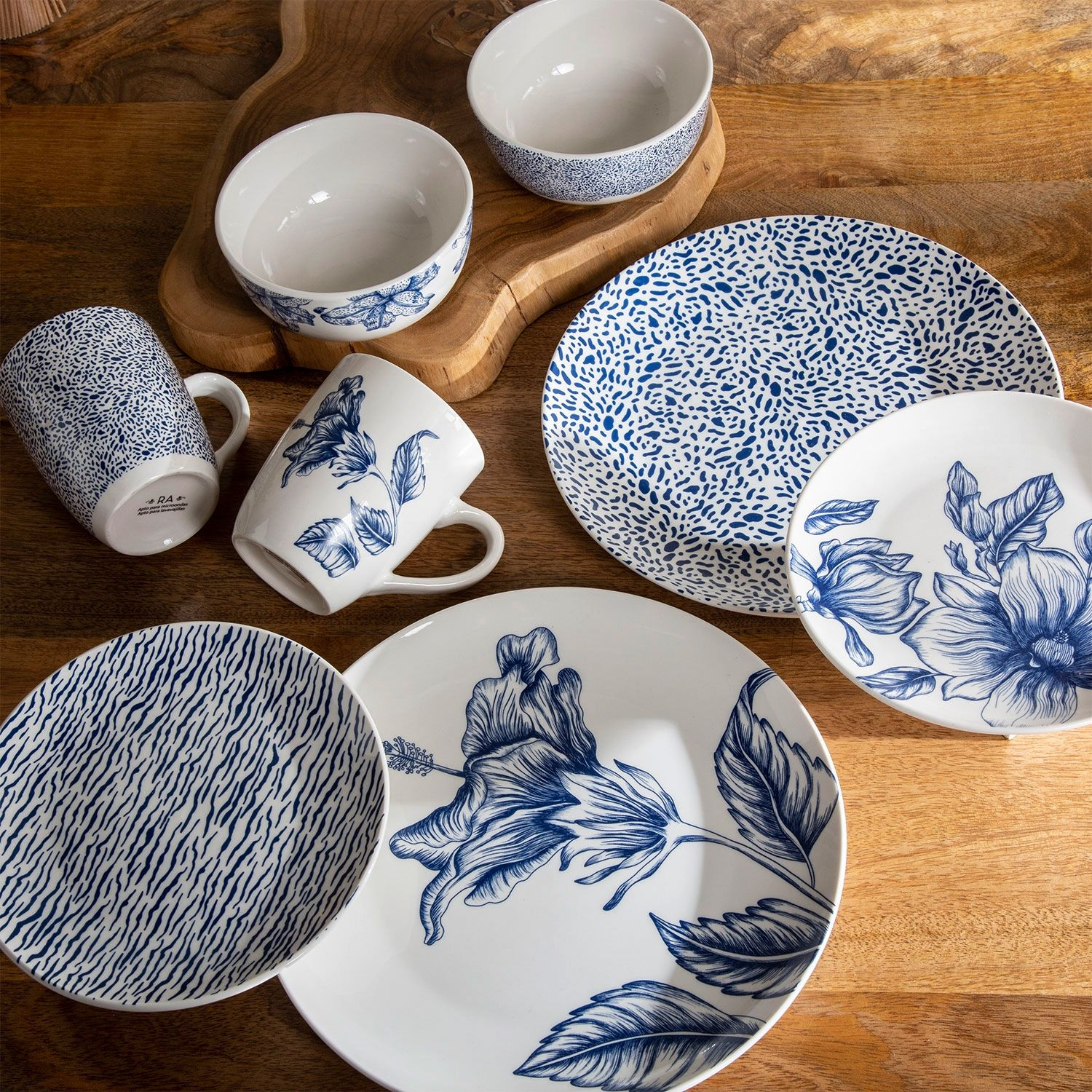 El diseño Botanical Blue, con delicados motivos florales en tonos azules, evoca la serenidad de la naturaleza, creando un ambiente relajante y acogedor. Cada pieza está fabricada en cerámica de alta calidad, garantizando durabilidad y resistencia al uso constante. Este juego de vajilla no solo es hermoso, sino también práctico, ya que es apto para lavavajillas y microondas, facilitando la limpieza y el calentamiento de tus alimentos.
