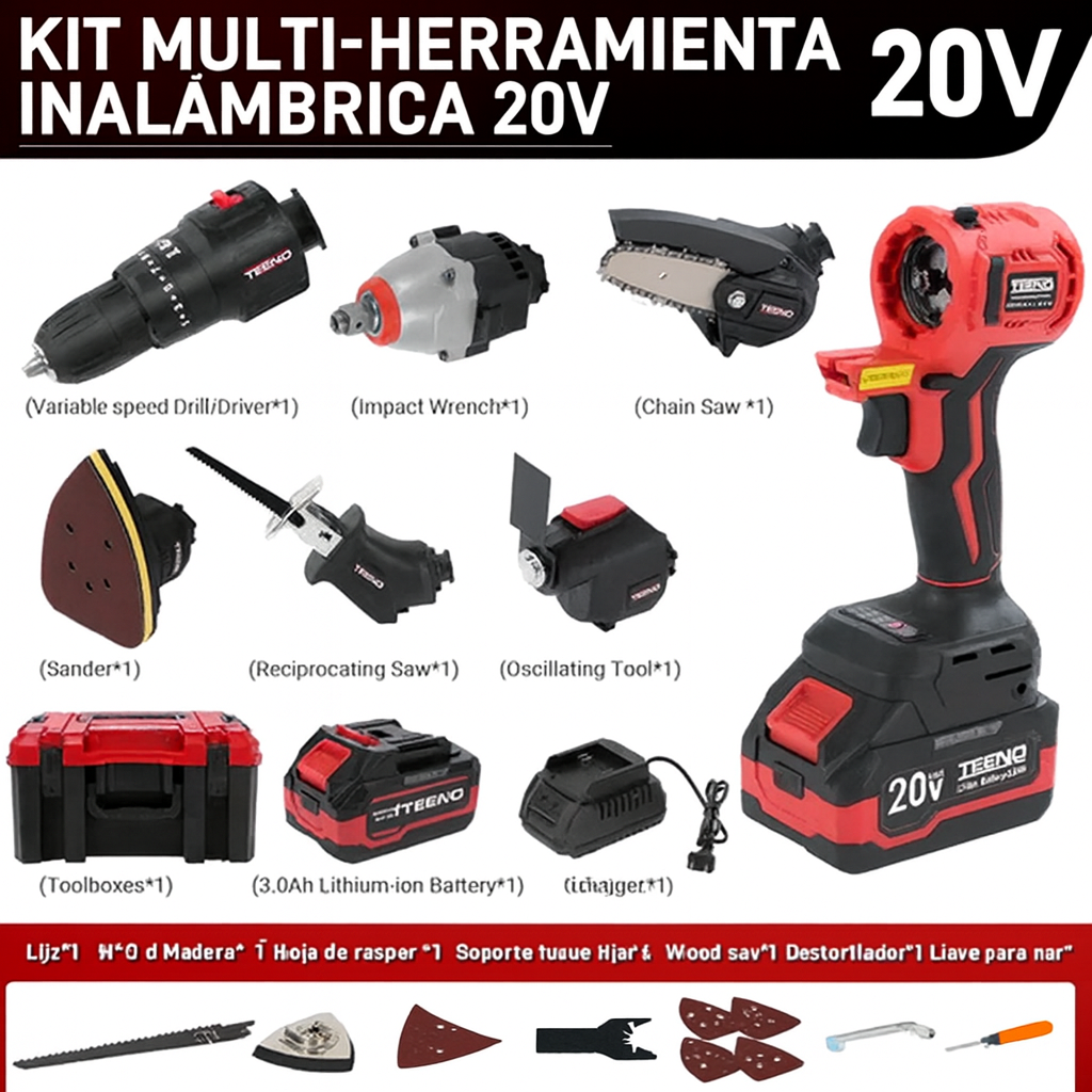 El Kit de Herramientas Inalámbricas Multifuncional 6 en 1 está diseñado para ofrecerte todo lo que necesitas en un solo equipo, combinando potencia, versatilidad y practicidad. Este set reúne caladora, lijadora, pistola de impacto, taladro, pulidora e hidrolavadora, todas alimentadas por baterías recargables de 21V para trabajar sin la limitación de cables.