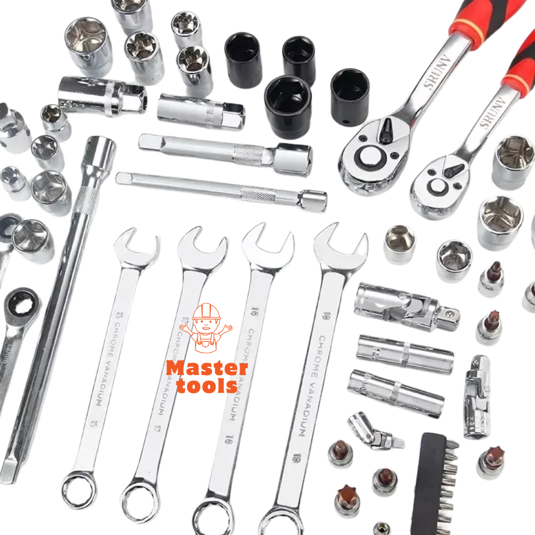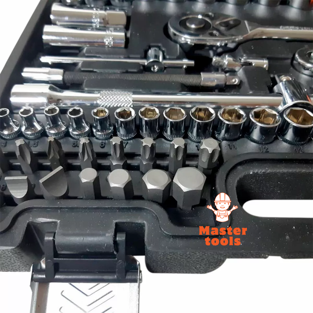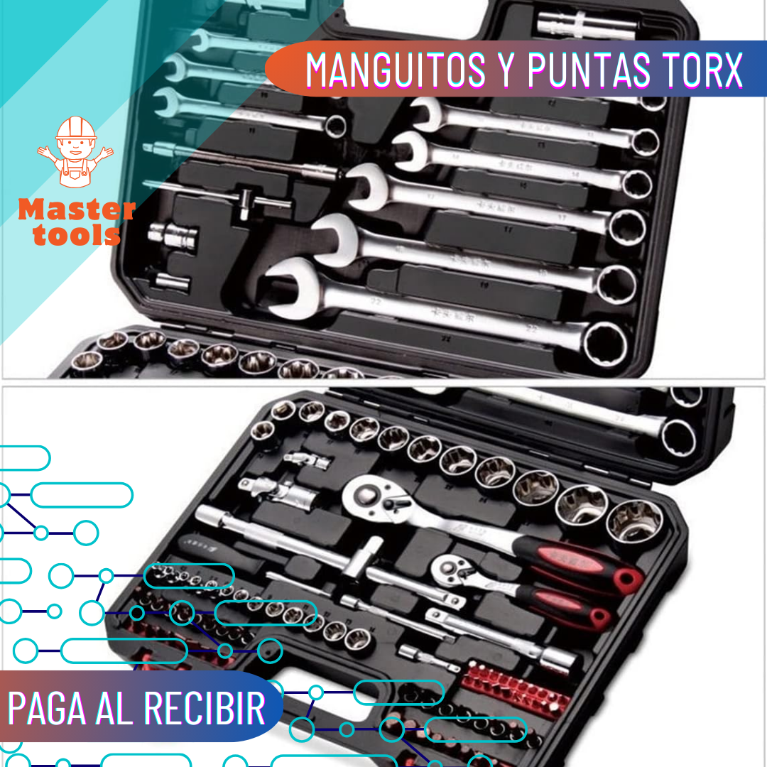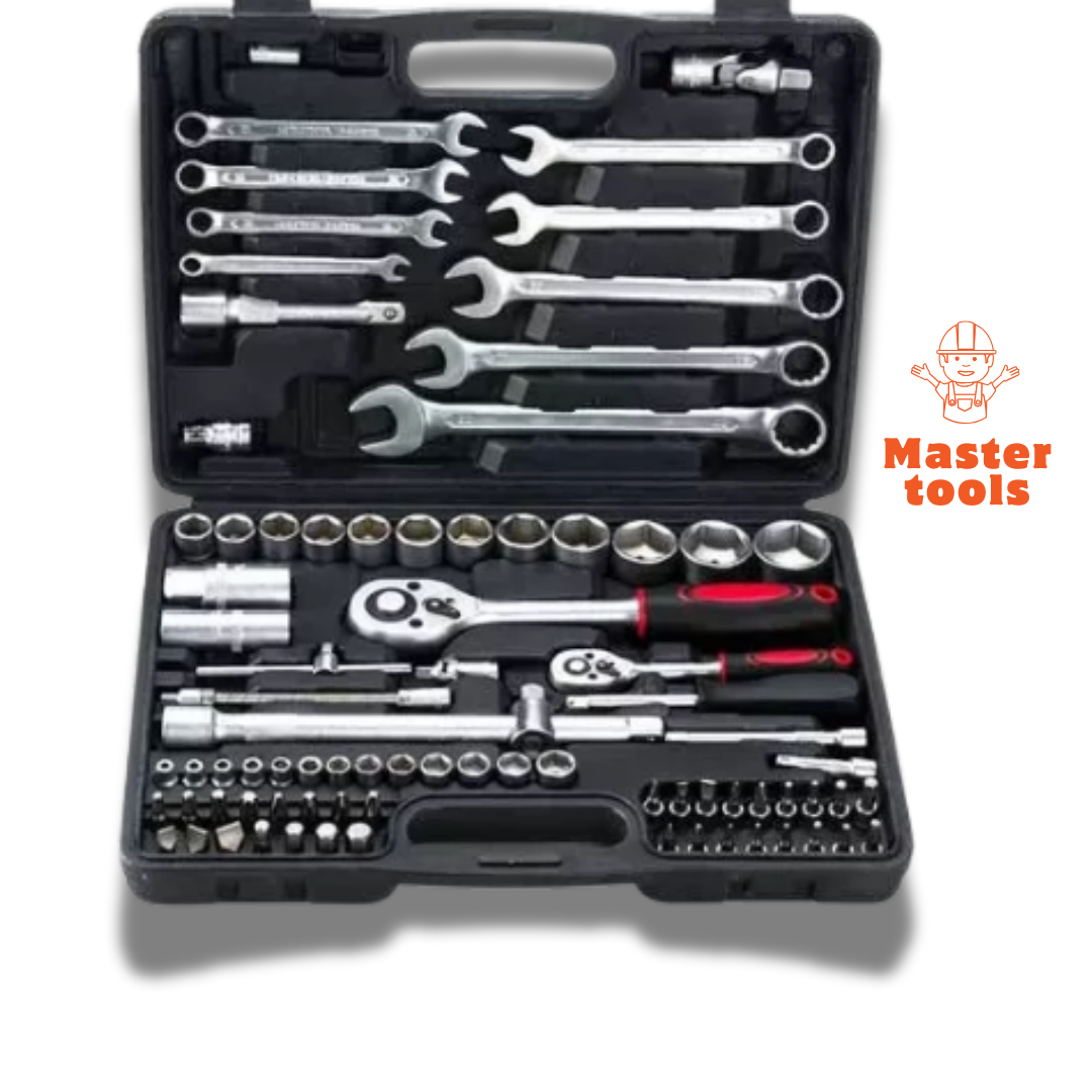 Este juego de herramientas multifuncional está diseñado para satisfacer las necesidades de mecánicos, aficionados al bricolaje y profesionales que buscan precisión, durabilidad y versatilidad. Compuesto por más de 90 piezas de alta calidad fabricadas en acero cromo vanadio (CR-V), este kit ofrece una solución completa para trabajos de reparación, mantenimiento y ensamblaje en automóviles, maquinaria y proyectos domésticos. Incluye llaves de carraca, manguitos, conectores multidireccionales, barras de extensión y puntas giratorias, todo organizado para maximizar la eficiencia y el rendimiento.