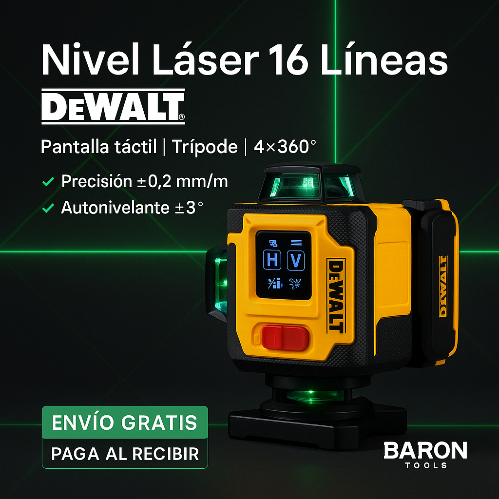 El Nivel Láser DeWalt de 16 líneas con pantalla táctil y trípode está diseñado para marcar, alinear y nivelar con máxima precisión y rapidez. Sus 4 planos 360° permiten trabajar en piso, paredes y techo sin reubicar el equipo, mientras la interfaz táctil simplifica la selección de líneas y el ajuste de brillo. Con autonivelación y 2 baterías recargables, mantienes un flujo de trabajo continuo y ordenado gracias al estuche rígido incluido.
