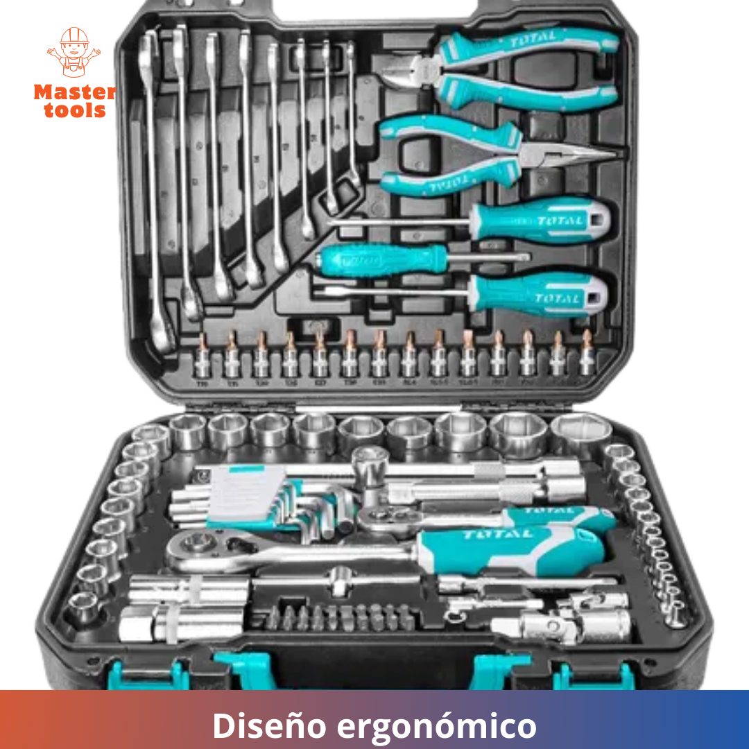 Con el Set de 100 piezas TOTAL, llevarás tu trabajo al siguiente nivel. Diseñado para profesionales y apasionados del bricolaje, este kit incluye lo esencial para tareas mecánicas, mantenimiento, electricidad y mucho más.
